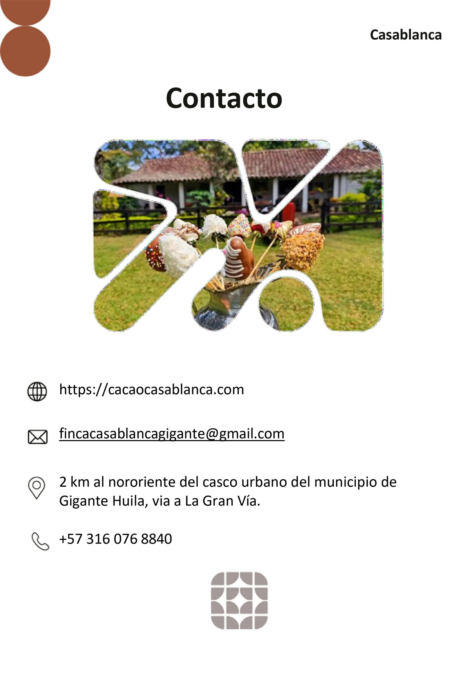 Casablanca Contacto https://fincaagroturisticacasablanca.negocioenlinea.com.co fincacasablancagigante@gmail.com 2 km al nororiente del casco urbano del municipio de Gigante Huila, via a La Gran Vía. +57 316 076 8840
